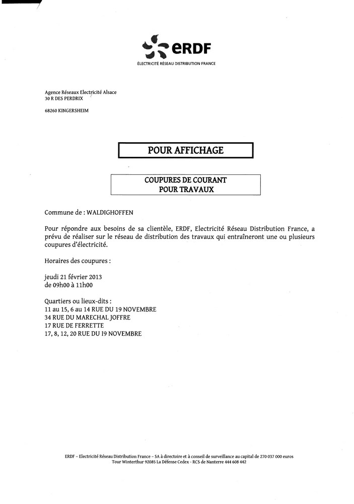 Vous êtes ici : Accueil Mairie Affichage public Annexes affichage public 2013 Coupure de courant