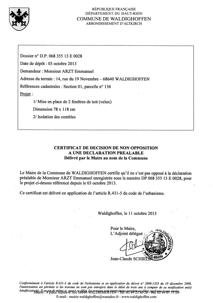 Avis de non opposition à la déclaration préalable n° 13E0028 déposée par Monsieur ARZT Emmanuel