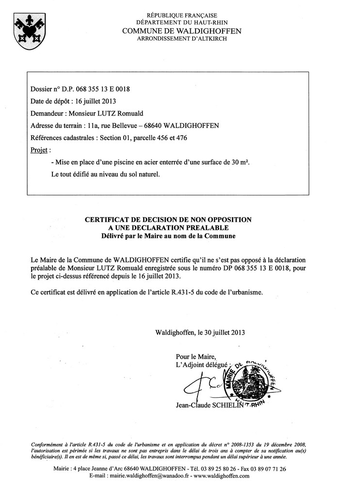 Avis de non opposition à la déclaration préalable de Monsieur LUTZ Romuald