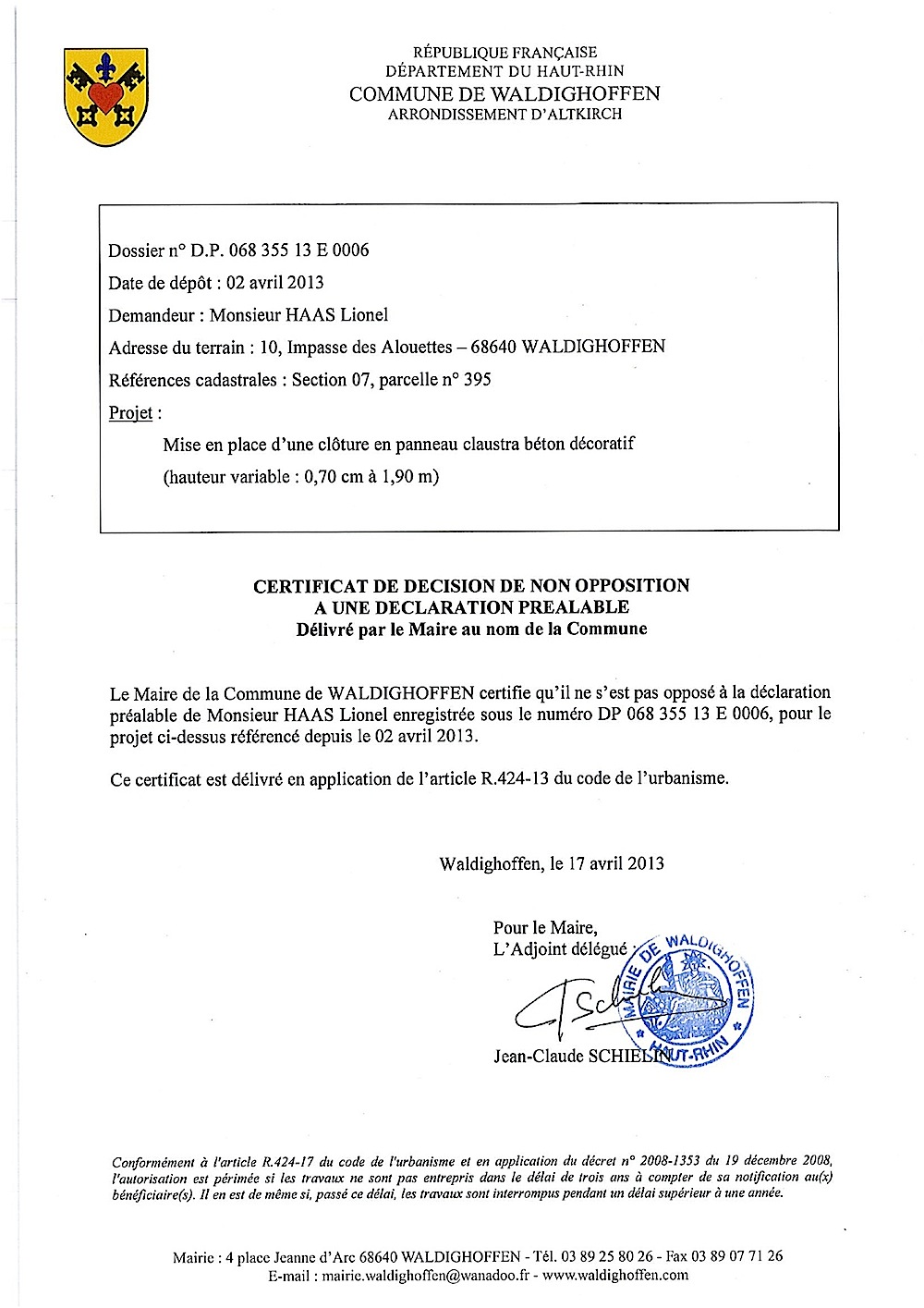 Vous êtes ici : Accueil Mairie Affichage public Annexes affichage public 2013 Non opposition DP 13E0006 Haas Lionel
