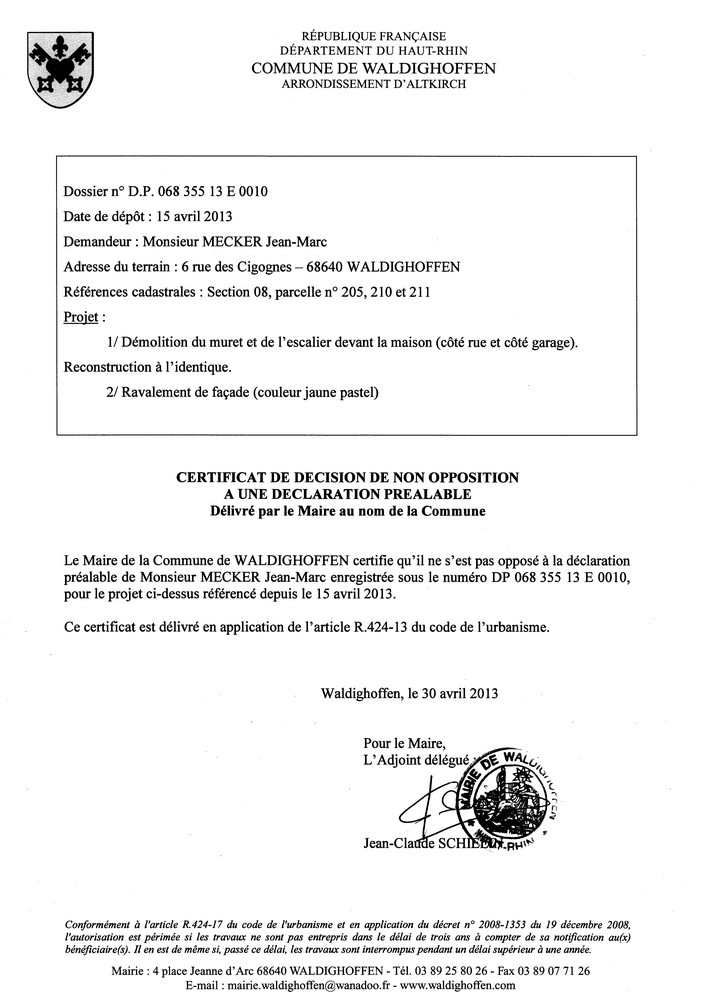Vous êtes ici : Accueil Mairie Affichage public Annexes affichage public 2013 Non-opposition à la déclaration préalable n°13E0010 - M. MECKER