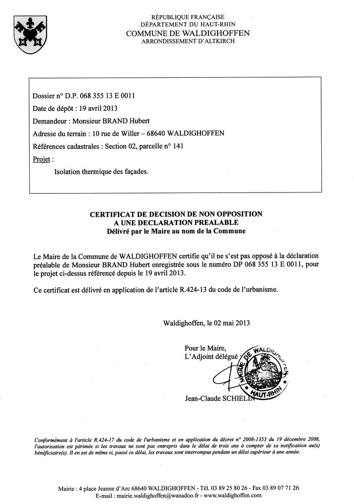 Non-opposition à la déclaration préalable n°13E0011 - M. BRAND