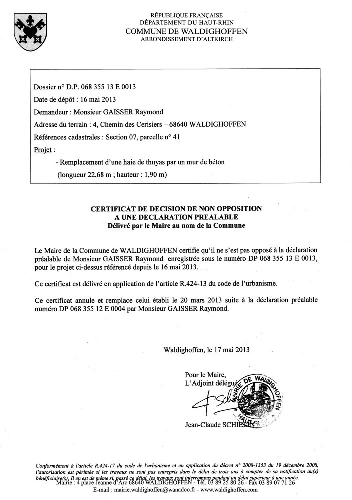 Vous êtes ici : Accueil Mairie Affichage public Annexes affichage public 2013 Non-opposition à la déclaration préalable n°13E0013 - M. GAISSER