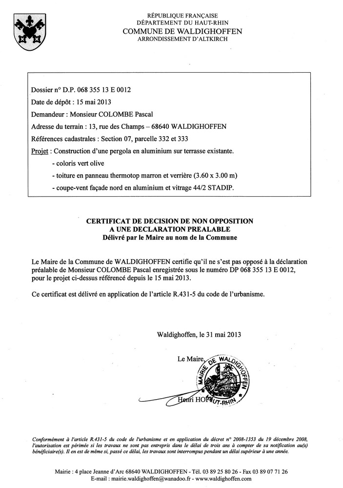 Avis de non opposition à la déclaration préalable de Monsieur COLOMBE Pascal