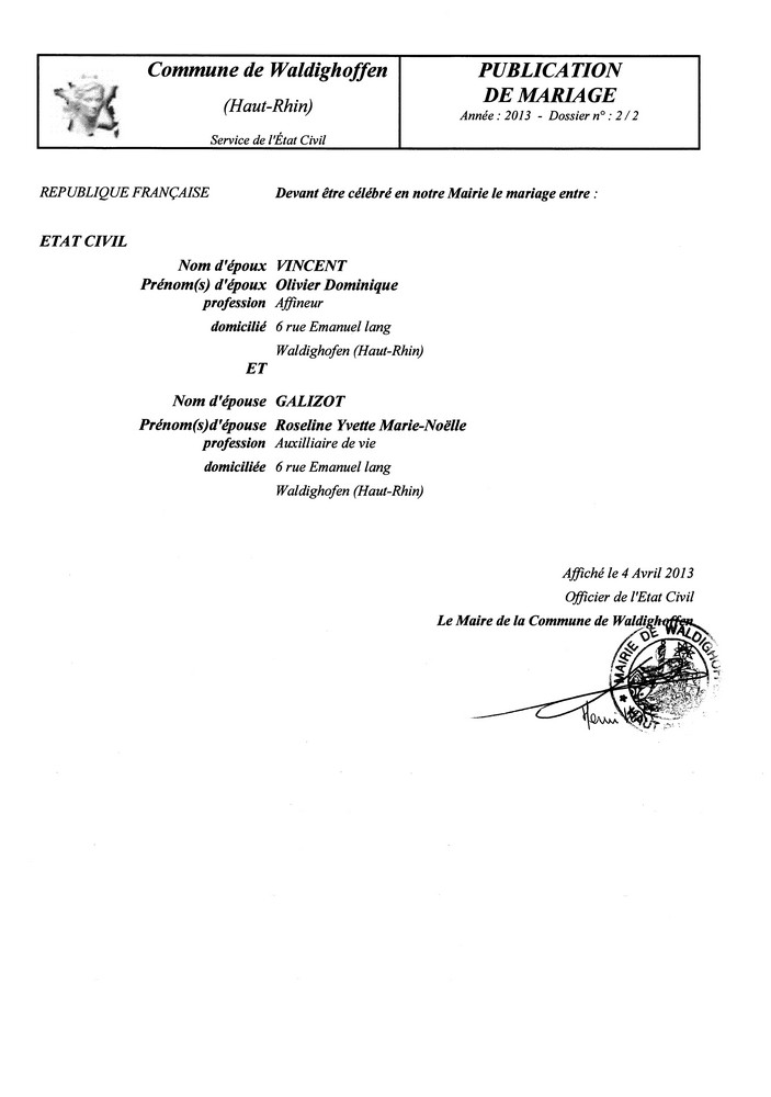 Publication de mariage projeté entre Monsieur VINCENT Olivier et Mademoiselle GALIZOT Roseline domiciliés à WALDIGHOFFEN au 6 rue Emmanuel Lang.