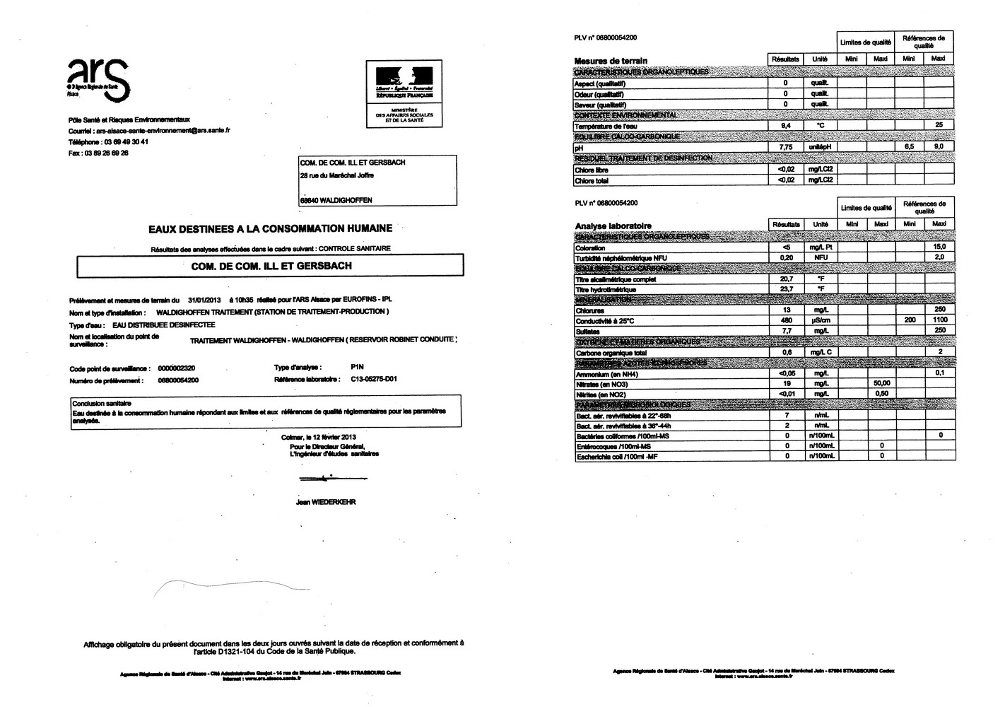 Copie du rapport d'analyse de l'eau potable de Waldighoffen du 12 février 2013. Prélèvement effectué le 31 janvier 2013.