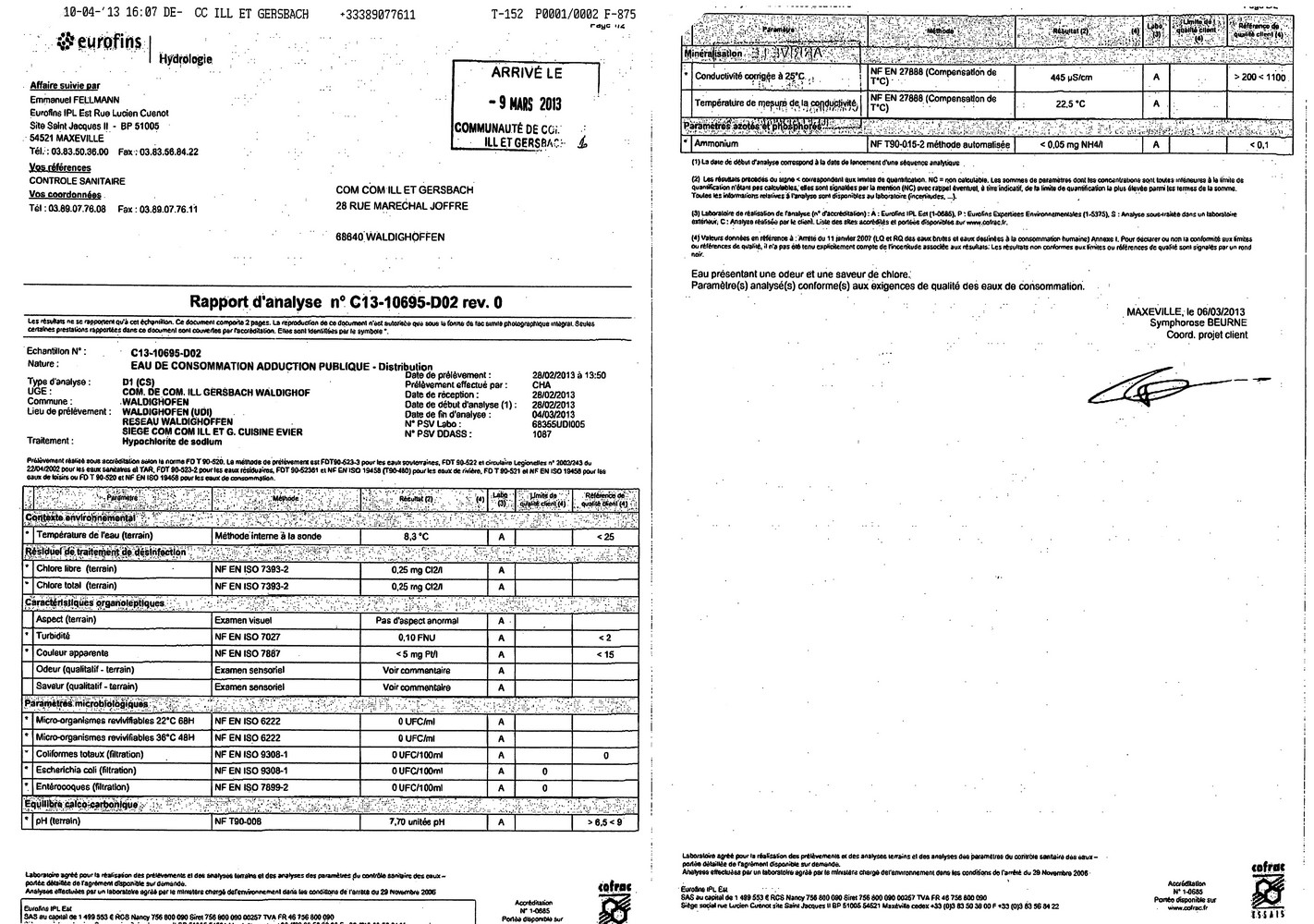 Rapport d'analyse d'eau potable n°C13-10695-D02 du 06.03.2013