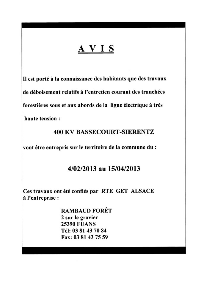 Des travaux d'élagage, d'abattage, de débroussaillage vont être entrepris sur la Commune de Waldighoffen du 04 février au 15 avril 2013.