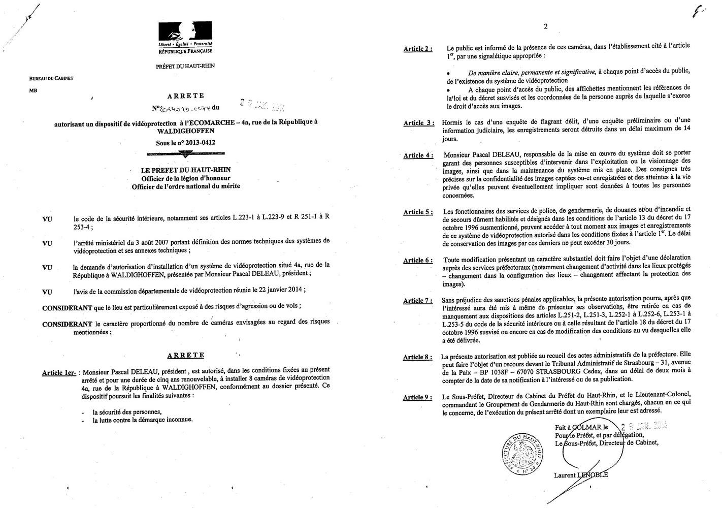 Arrêté autorisant Monsieur DELEAU Pascal a mettre en place un système de vidéoprotection à l'ECOMARCHE