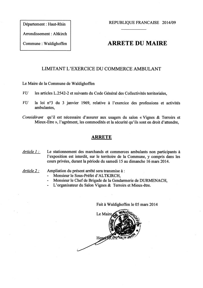 Arrêté limitant l'exercice du commerce ambulant à l'occation de la manifestation "salon vignes et terroirs et mieux-être" qui aura lieu les 15 et 16 mars 2014