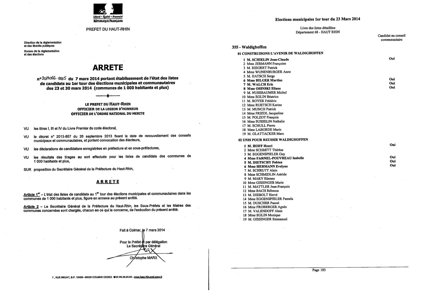 Arrêté portant établissement de l'état des listes de candidats au 1er tour des élections municipales de 2014