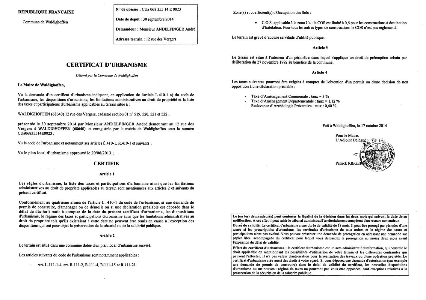 Un certificat d'urbanisme a été établi pour Monsieur ANDELFINGER André, concernant un terrain situé au 12 rue des Vergers. Dossier n°CUa 06835514E0023