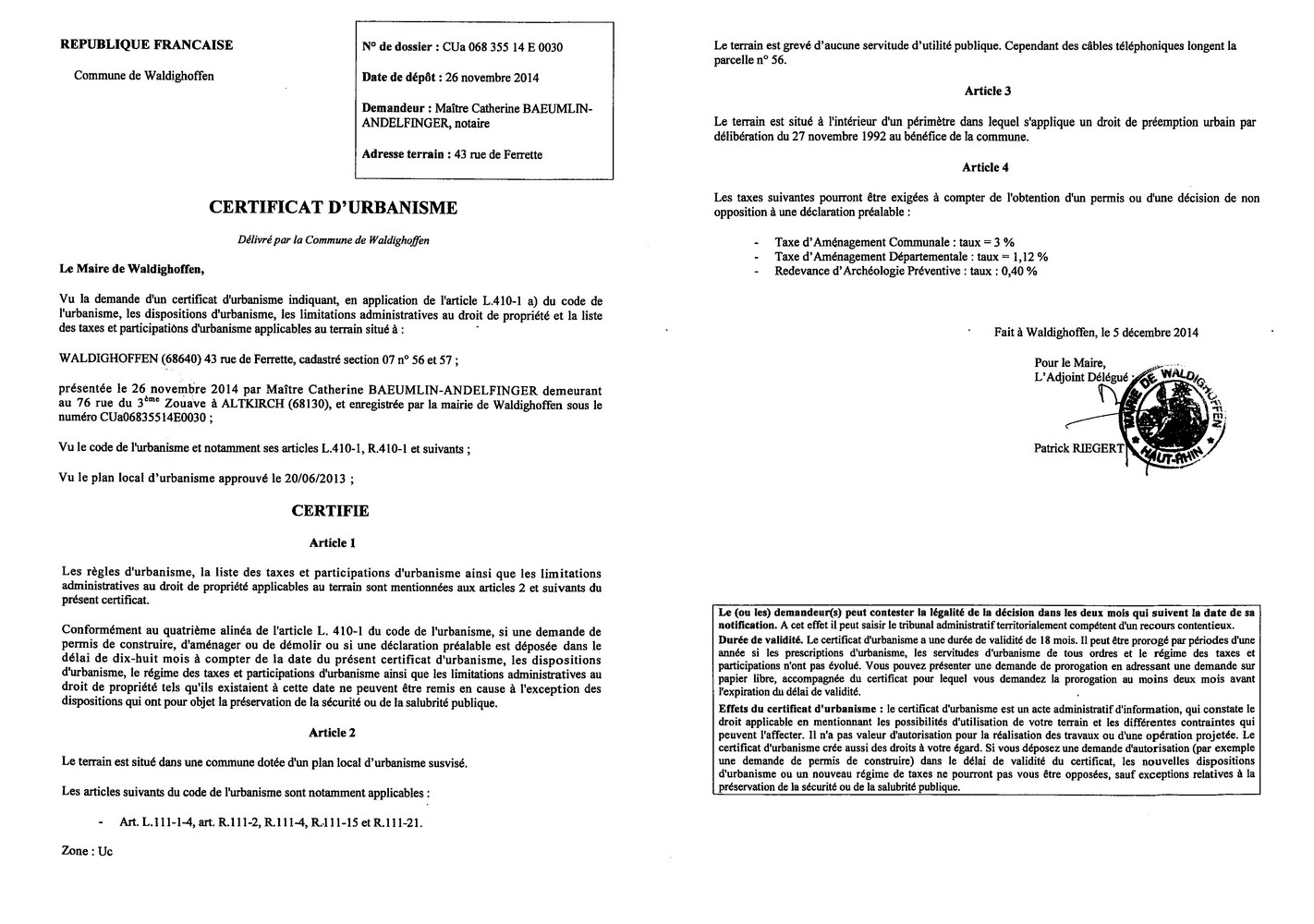 Certificat d'urbanisme délivré à Maître BAEUMLIN-ANDELFINGER, notaire