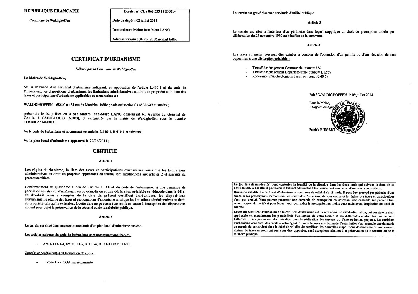 Un certificat d'urbanisme a été établi pour Maître Jean-Marc LANG, concernant un terrain situé au 34 rue du Maréchal Joffre. Dossier n°CUa 06835514E0014
