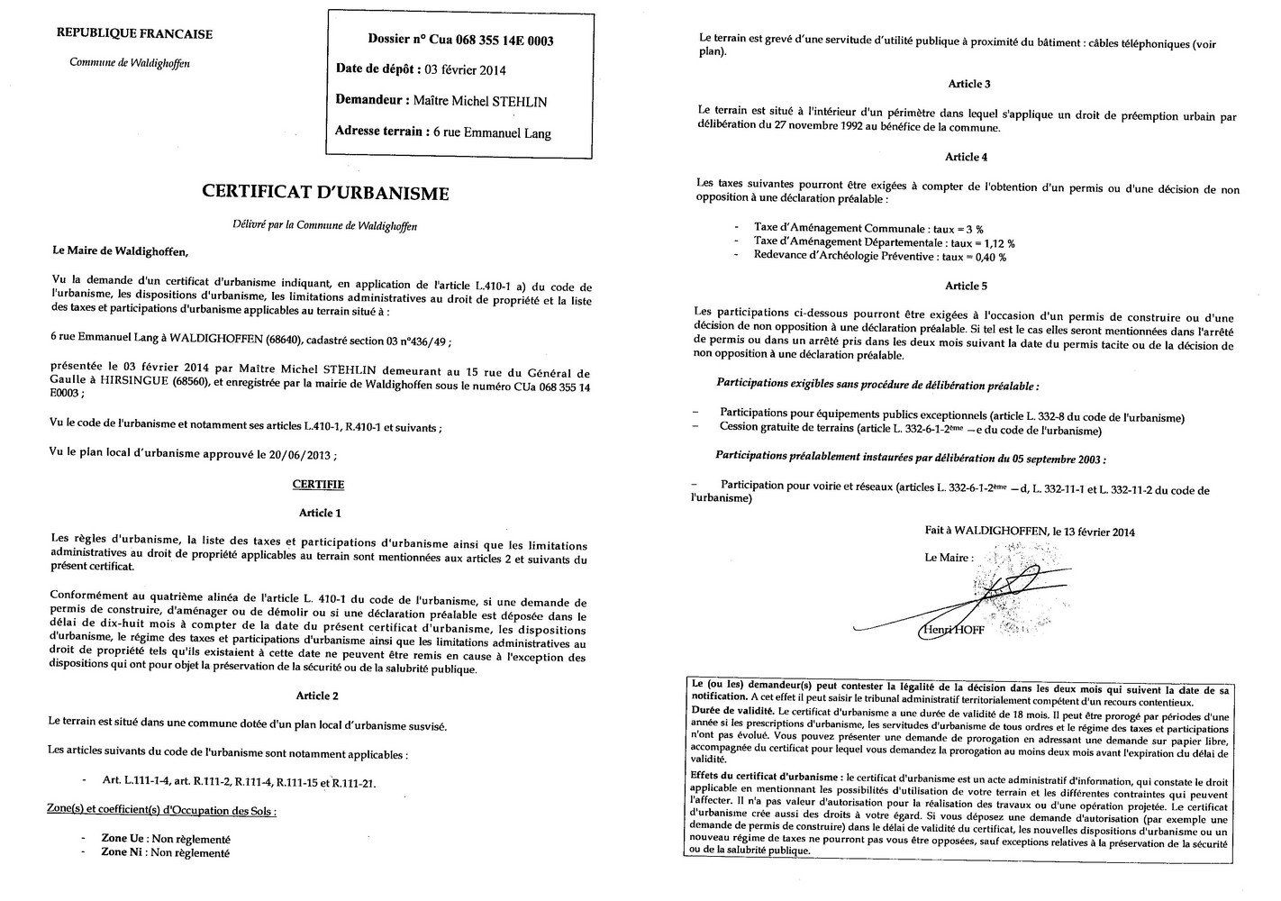 Certificat d'urbanisme délivré à Maître Michel STEHLIN