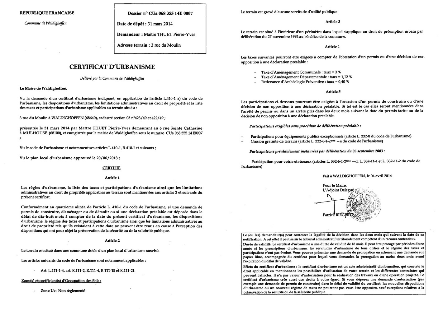 Le certificat d'urbanisme n°CUa 06835514E0007 a été établi pour Maître THUET Pierre-Yves, concernant un terrain situé au 3 rue du Moulin
