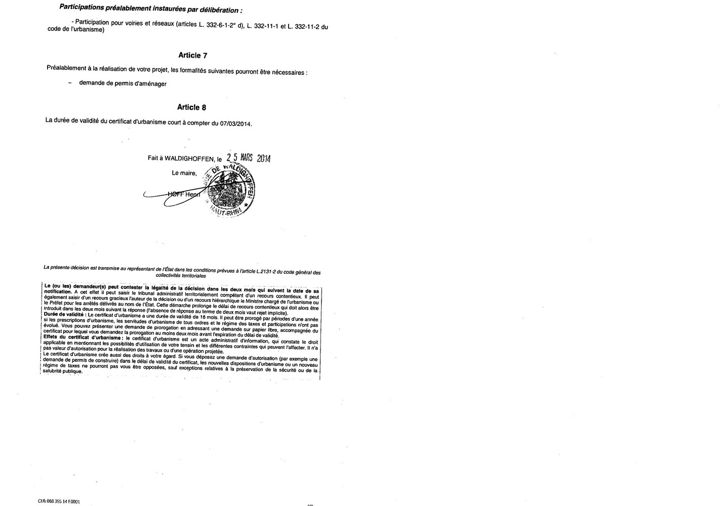 Vous êtes ici : Accueil Mairie Affichage public Annexes affichage public 2014 Certificat d'urbanisme délivré à Monsieur EGGENSPIELER François