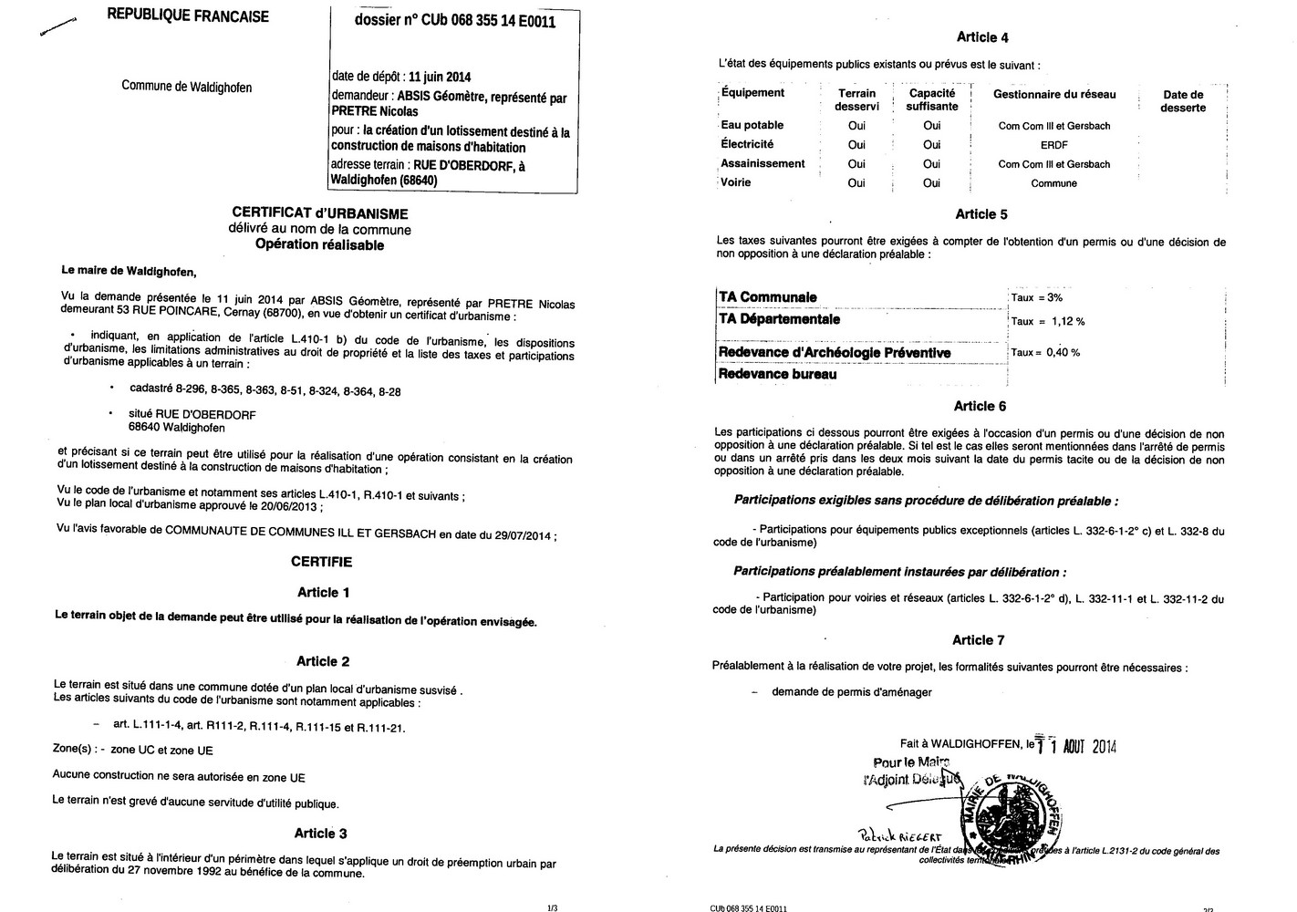 Un certificat d'urbanisme opérationel a été établi pour la Sàrl ABSIS géomètre, concernant des terrains situés rue d'Oberdorf. Dossier n°CUb 06835514E0011