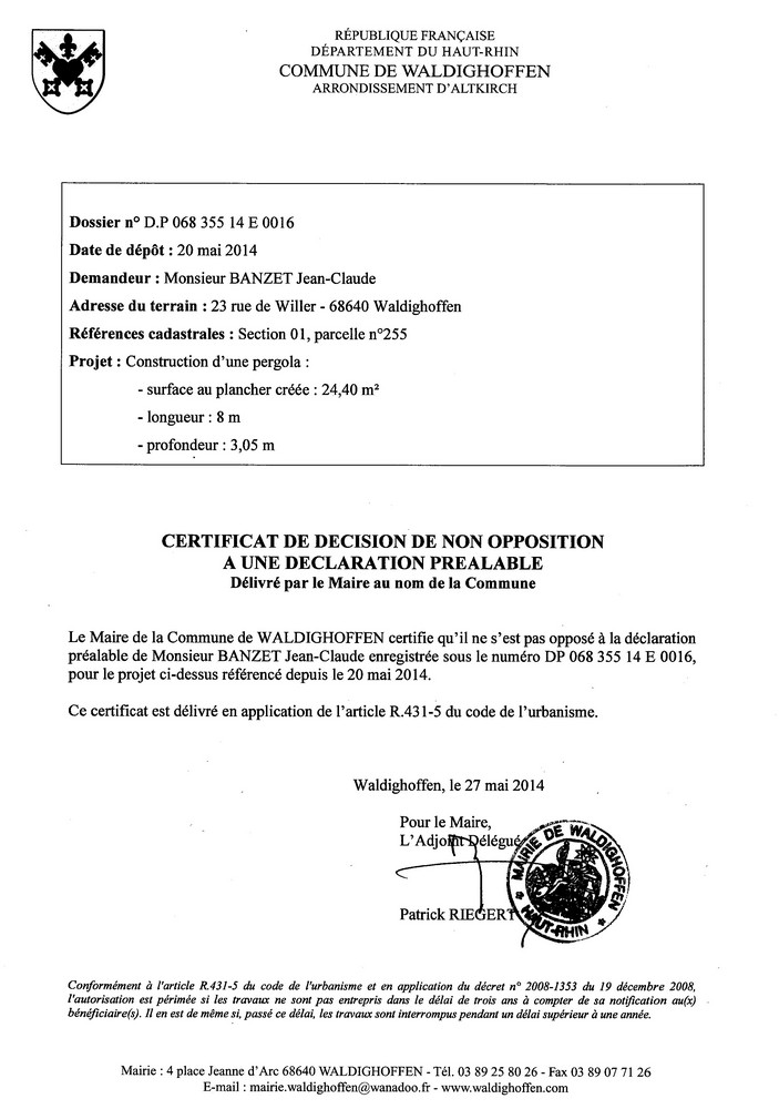 Vous êtes ici : Accueil Mairie Affichage public Annexes affichage public 2014 Décision à la déclaration préalable de M. BANZET Jean-Claude