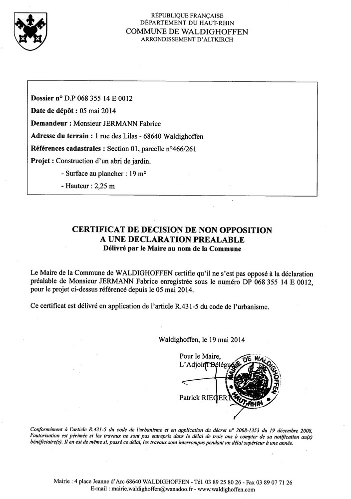 Vous êtes ici : Accueil Mairie Affichage public Annexes affichage public 2014 Décision à la déclaration préalable de M. JERMANN Fabrice
