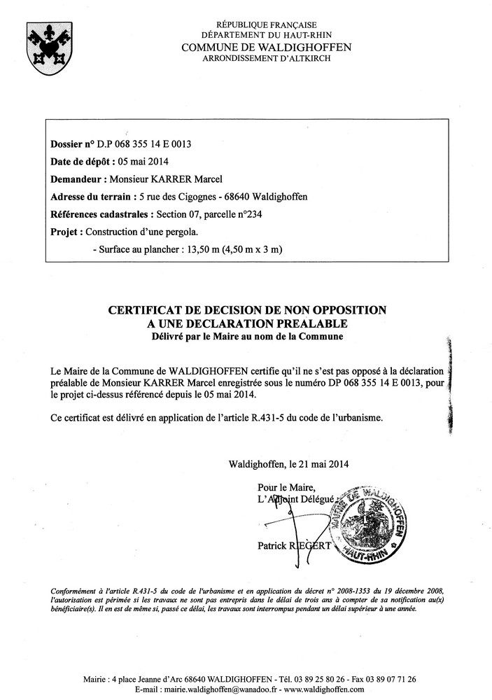 Vous êtes ici : Accueil Mairie Affichage public Annexes affichage public 2014 Décision à la déclaration préalable de M. KARRER Marcel