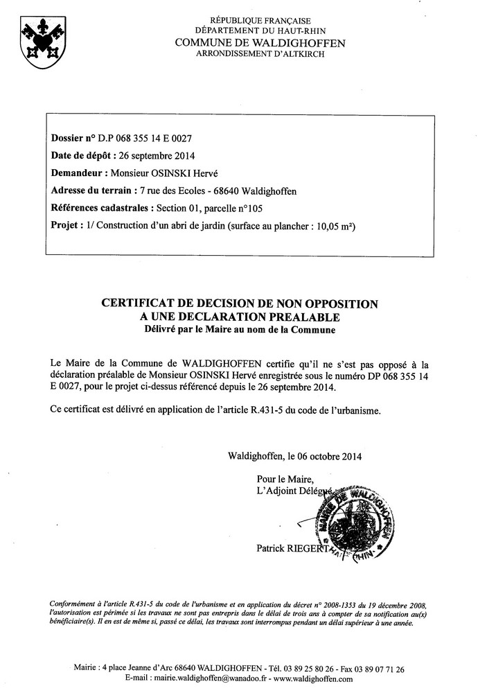 Avis de non opposition à la déclaration préalable déposée par Monsieur OSINSKI Hervé. Dossier n° DP 06835514E0027Avis de non opposition à la déclaration préalable déposée par Monsieur OSINSKI Hervé. Dossier n° DP 06835514E0027