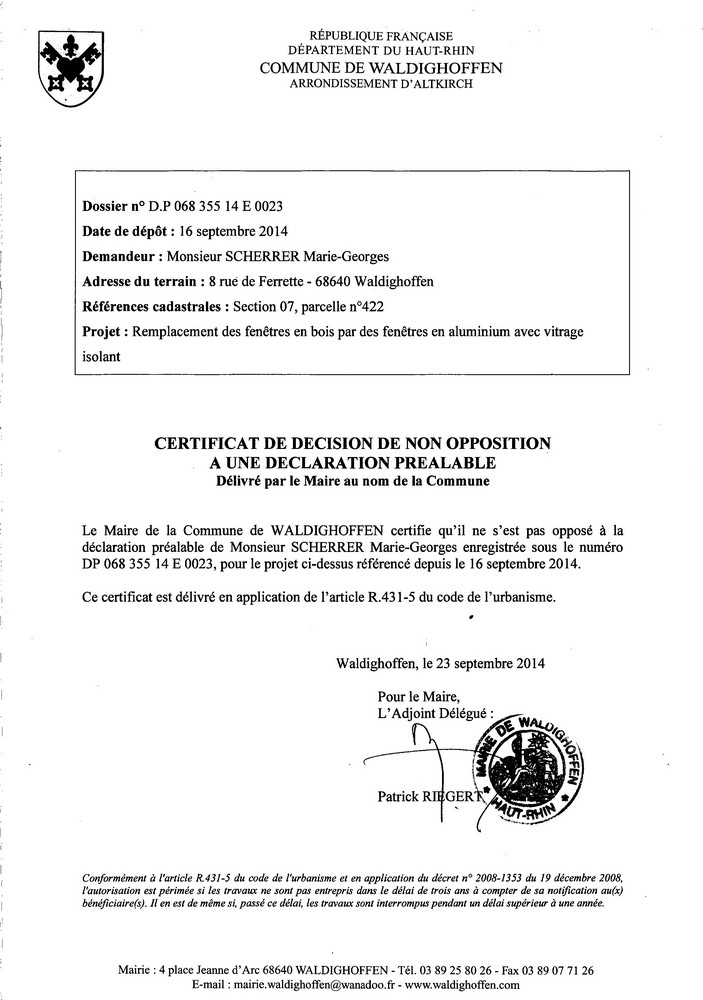 Vous êtes ici : Accueil Mairie Affichage public Annexes affichage public 2014 Décision à la déclaration préalable de M. SCHERRER Marie-Georges
