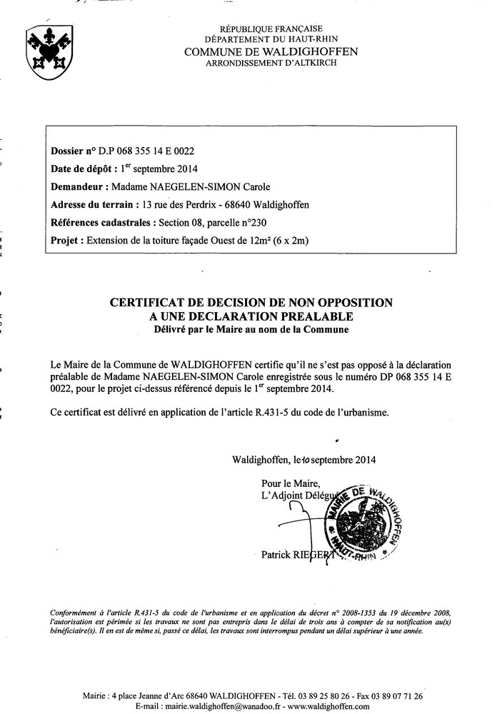 Avis de non opposition à la déclaration préalable déposée par Madame NAEGELEN-SIMON Carole. Dossier n° DP 06835514E0022