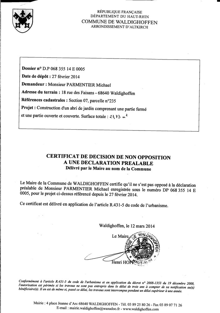 Vous êtes ici : Accueil Mairie Affichage public Annexes affichage public 2014 Décision à la déclaration préalable de Monsieur PARMENTIER Michael