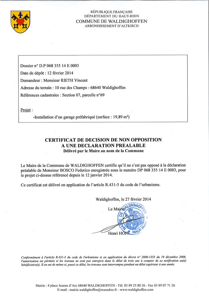 Vous êtes ici : Accueil Mairie Affichage public Annexes affichage public 2014 Décision à la déclaration préalable de Monsieur RIETH Vincent