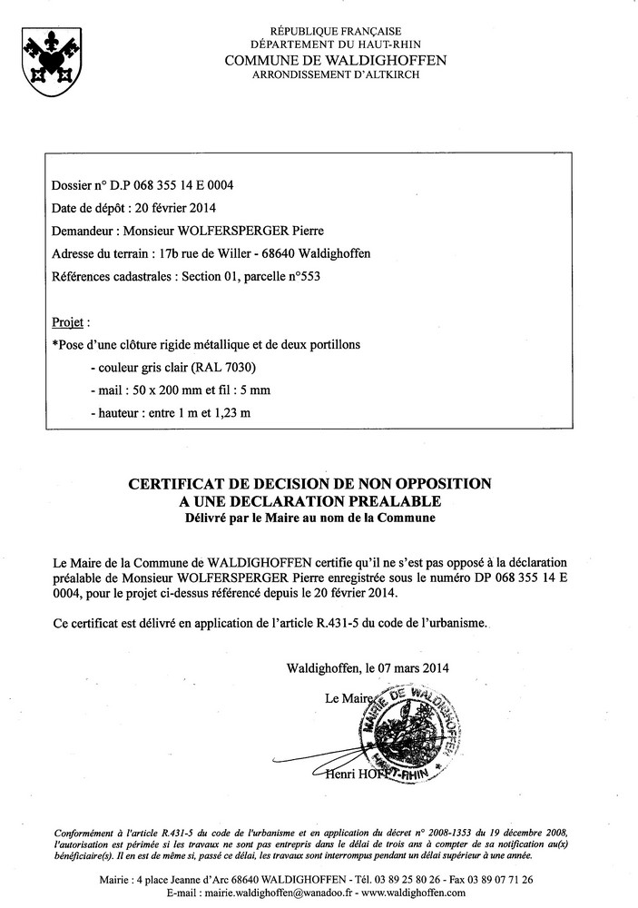 Décision à la déclaration préalable de Monsieur WOLFERSPERGER Pierre