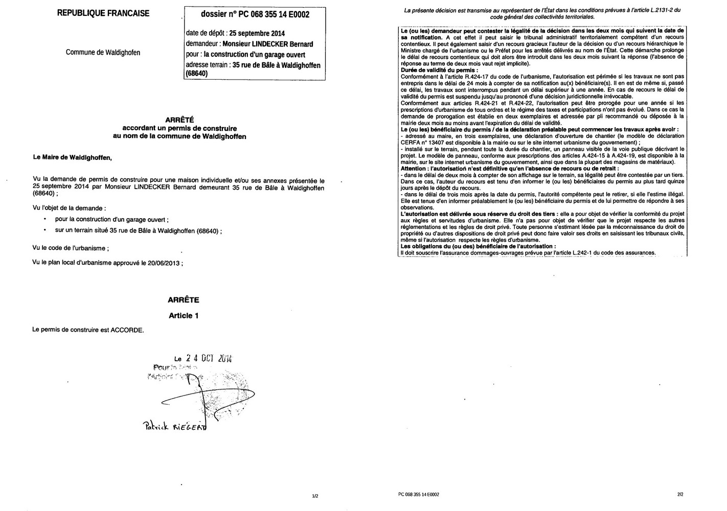Arrêté accordant la demande de permis de construire de Monsieur LINDECKER Bernard - Dossier n° PC 06835514E0002