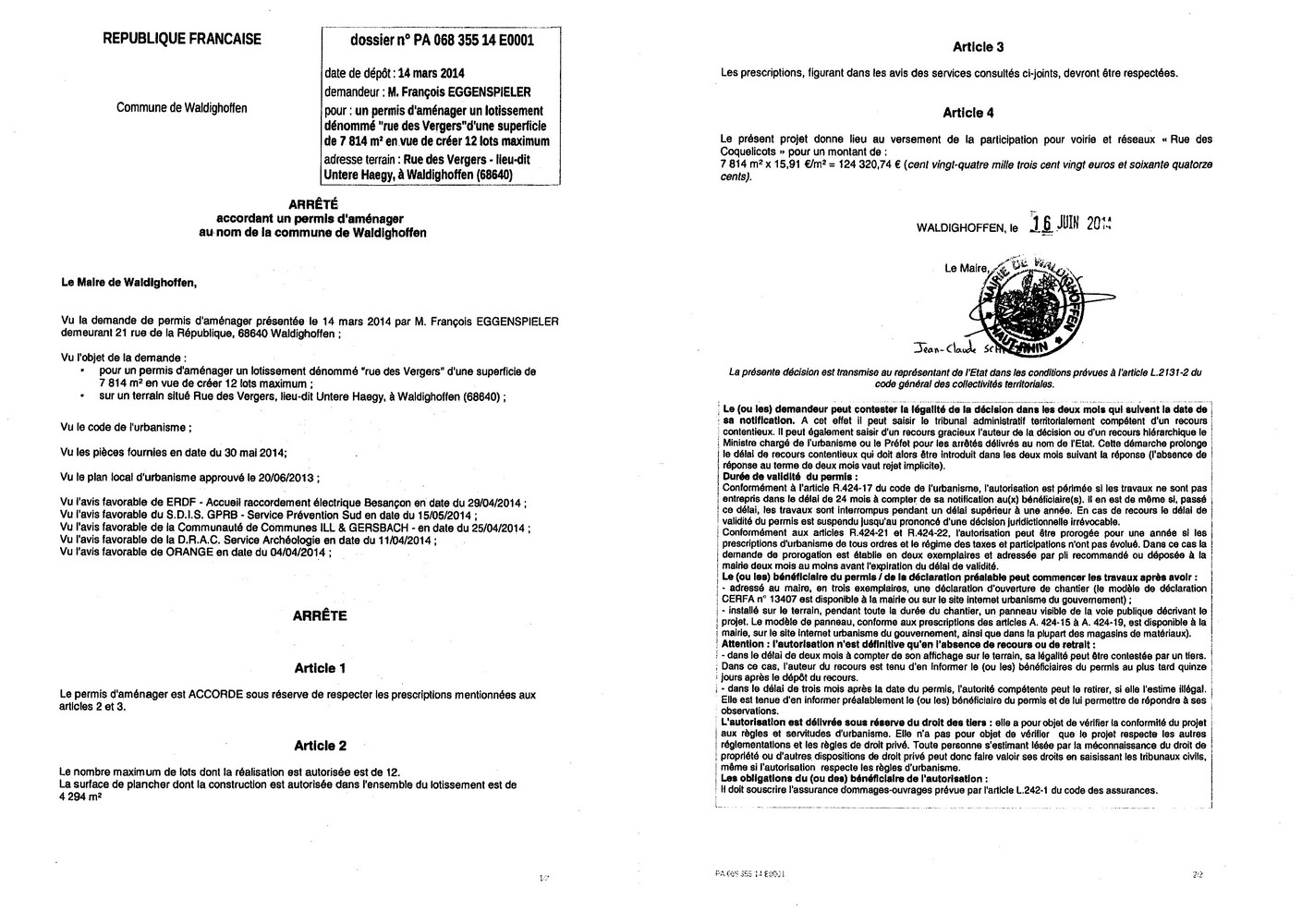 Décision à la demande de permis d'aménager de Monsieur EGGENSPIELER François