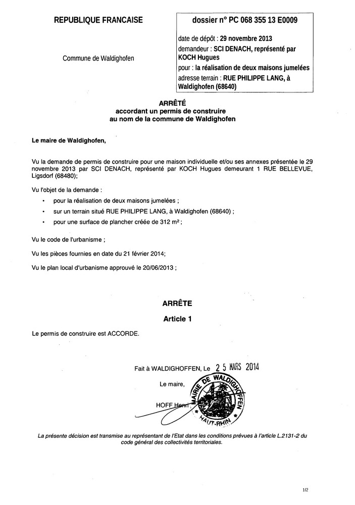 Arrêté accordant la demande de permis de construire n° 13E0009 à la SCI DENACH