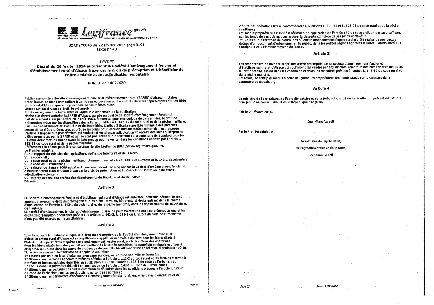 Vous êtes ici : Accueil Mairie Affichage public Annexes affichage public 2014 Décret du 20 février 2014 concernant la SAFER d'Alsace