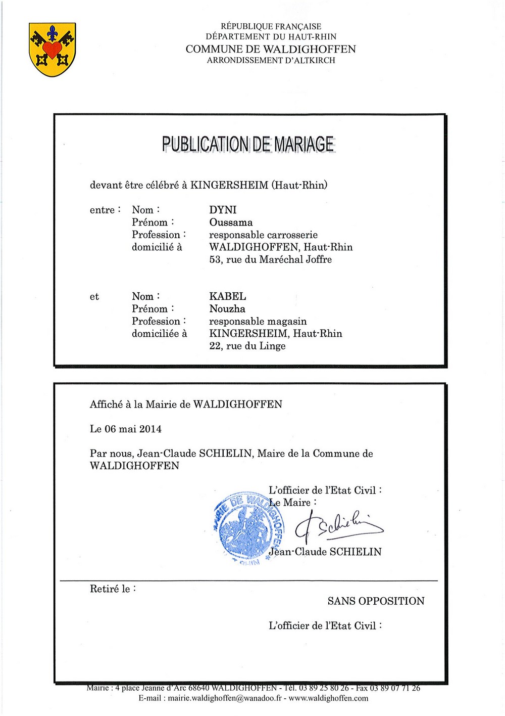 Publication du projet de mariage entre M. DYNI et Mlle KABEL.