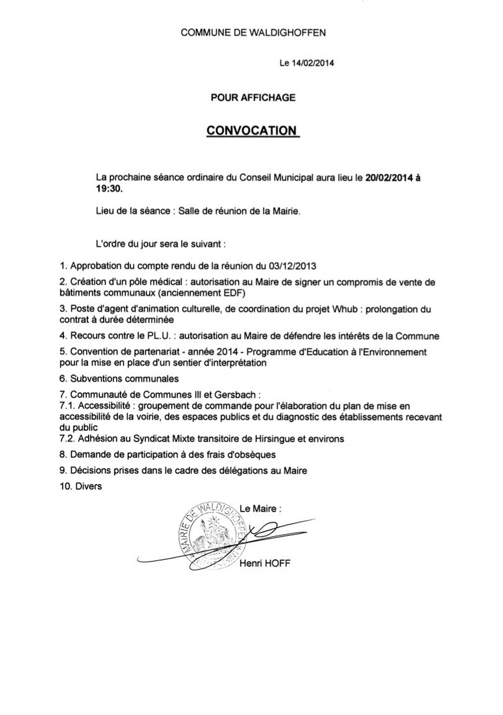 Le scan de la convocation du conseil municipale de Waldighoffen pour le 20 février 2014.