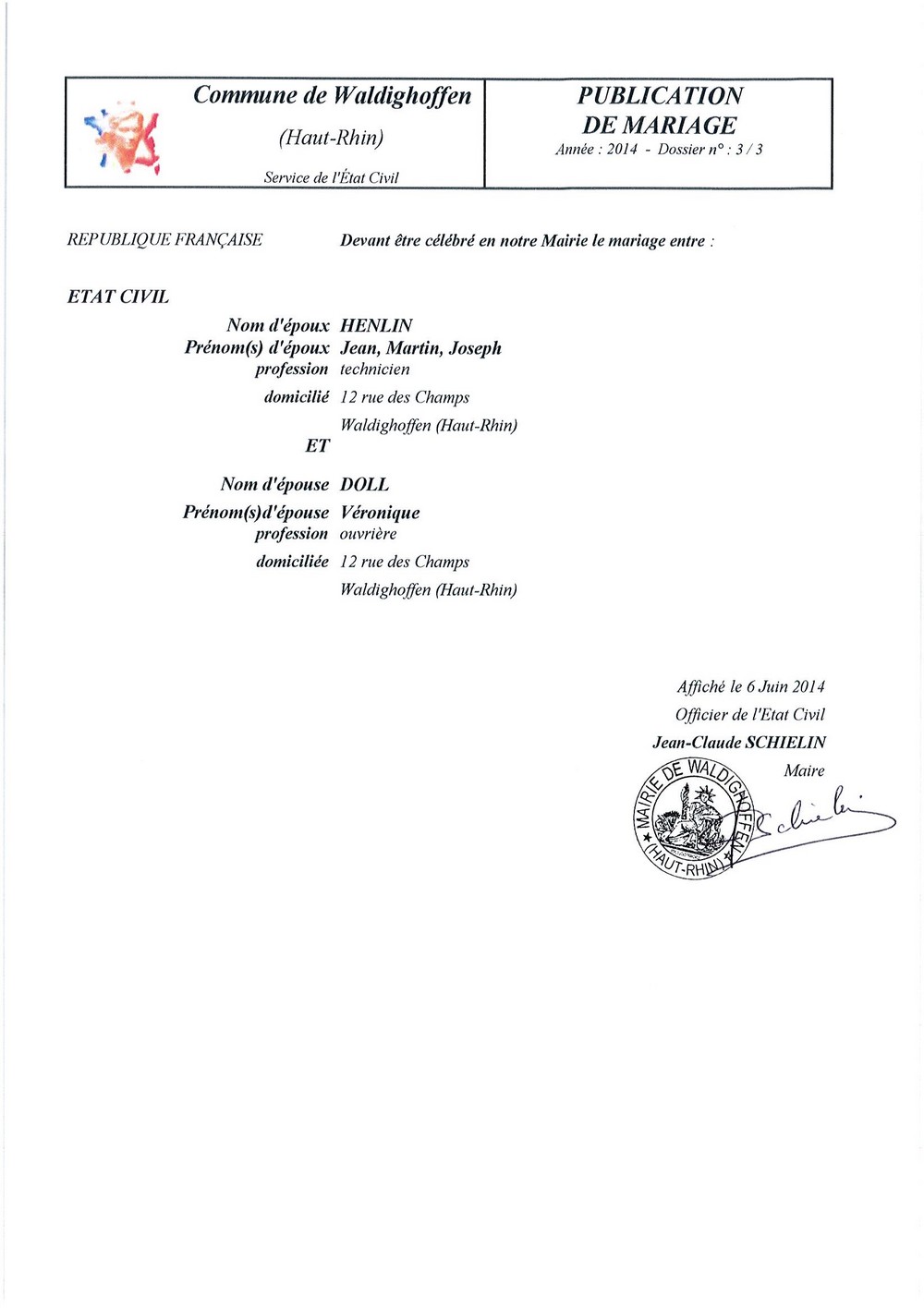 Vous êtes ici : Accueil Mairie Affichage public Annexes affichage public 2014 Publication Mariage Henlin Doll
