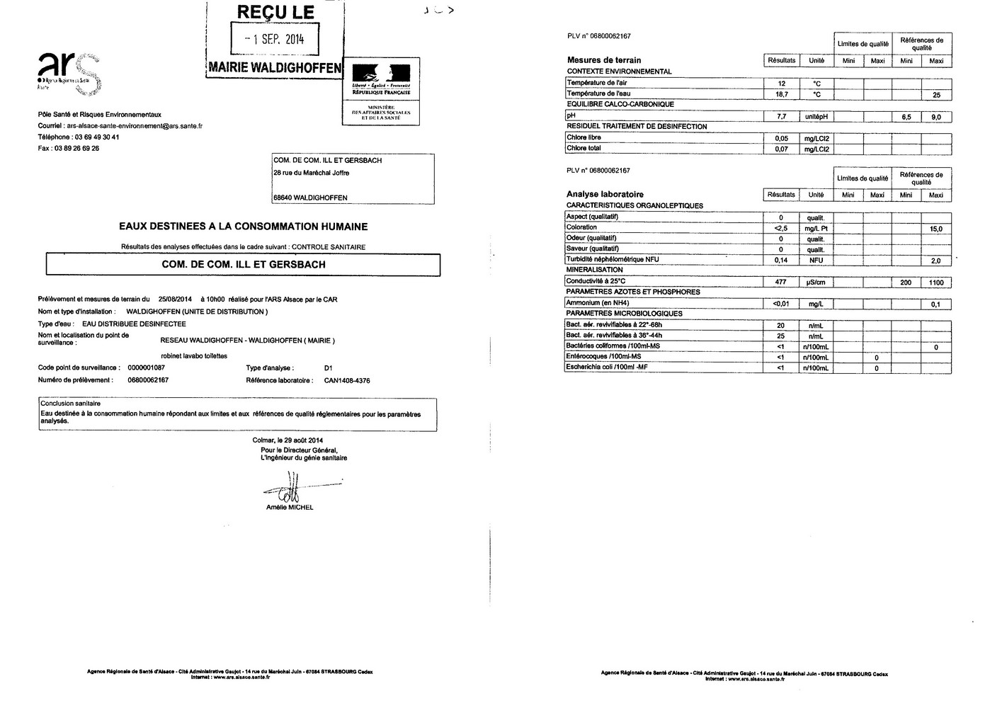 Copie du rapport d'analyse de l'eau potable de Waldighoffen du 29 août 2014. Prélèvement n°06800062167 effectué le 25 août 2014.