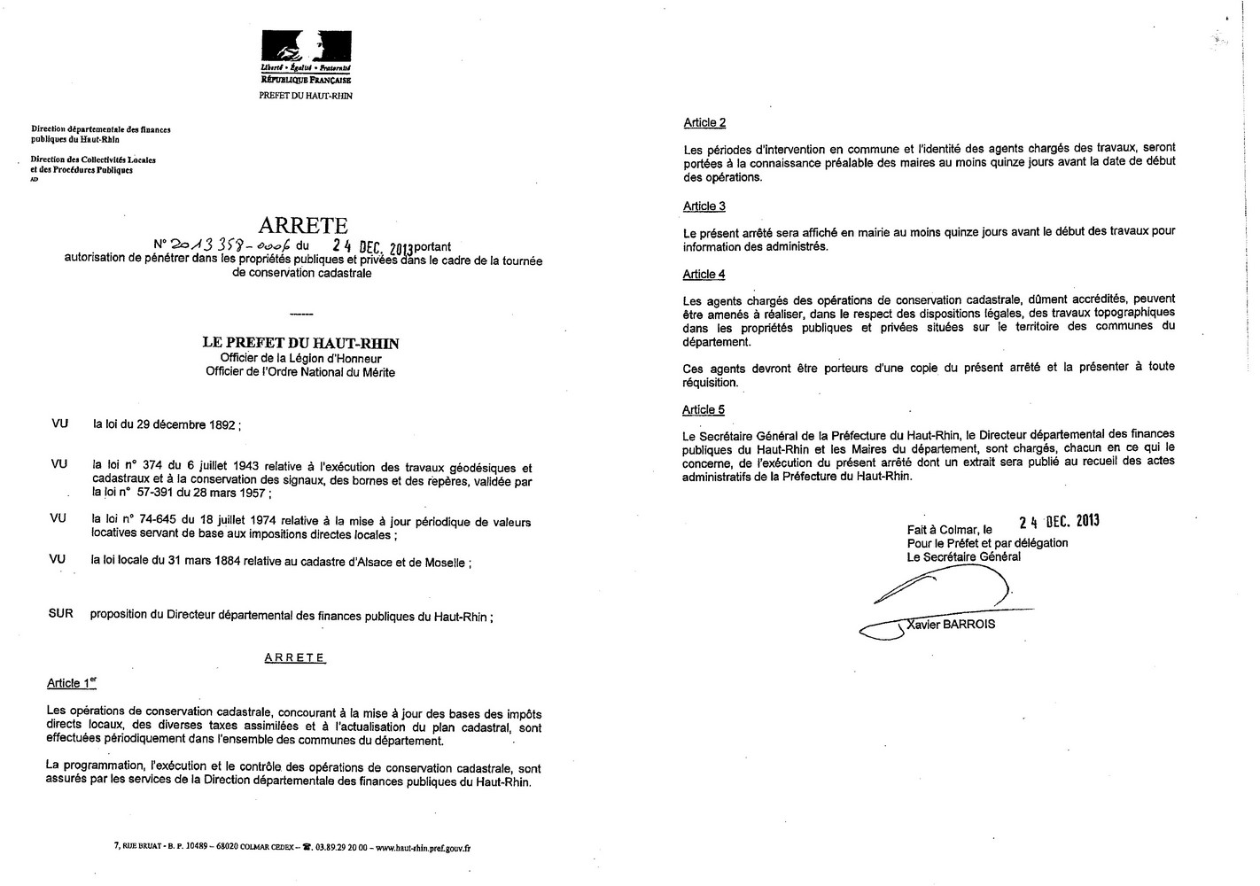 Arrêté préfectoral autorisant des agents dûment accrédités à pénétrer dans les propriétés publiques et privées dans le cadre de la tournée de conservation cadastrale.