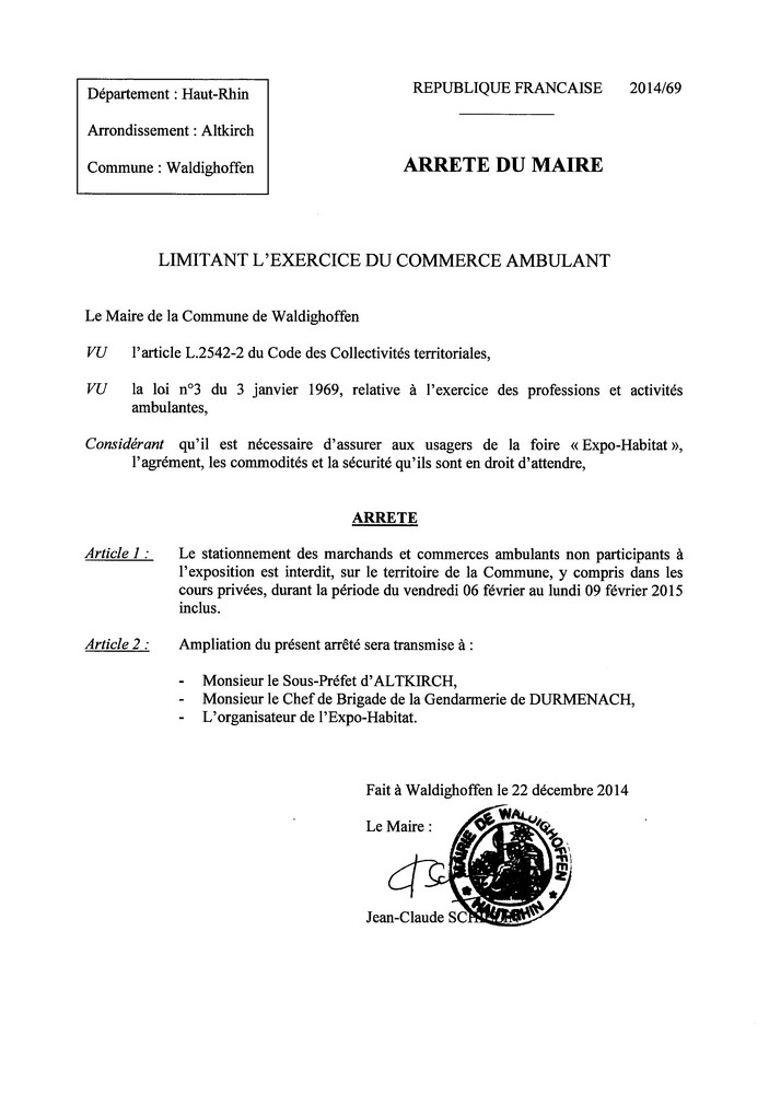 Vous êtes ici : Accueil Mairie Affichage public Annexes affichage public 2015 Arrêté 2014/69 - limitant l'exercice du commerce ambulant