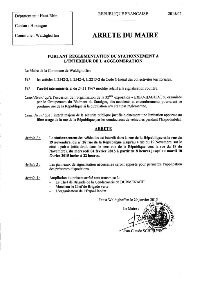 Arrêté du Maire règlementant le stationnement dans la rue de la République et la rue du 19 Novembre à l'occasion de la 32ème Expo-habitat