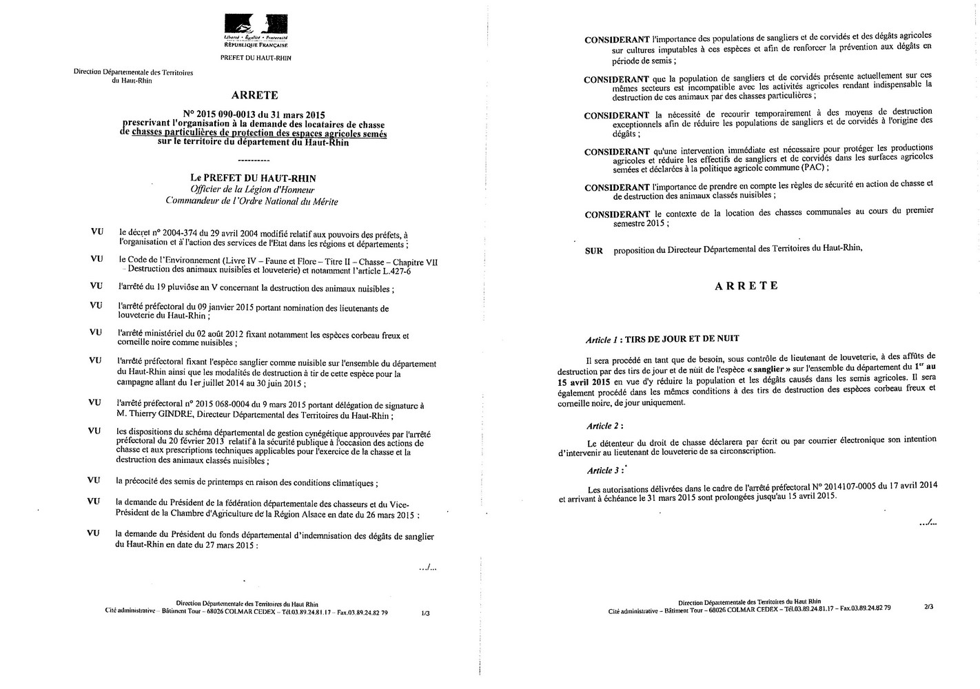 Arrêté prescrivant l'organisation de chasses particulières de protection des espaces agricoles semés sur le territoire du Haut-Rhin jusqu'au 15 avril 2015