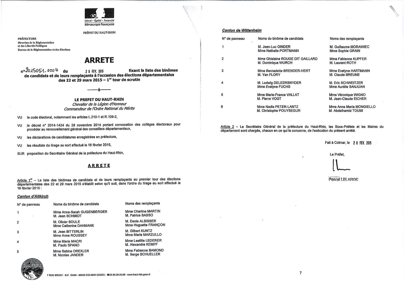 Arrêté préfectoral - élections départementales des 22 et 29 mars 2015