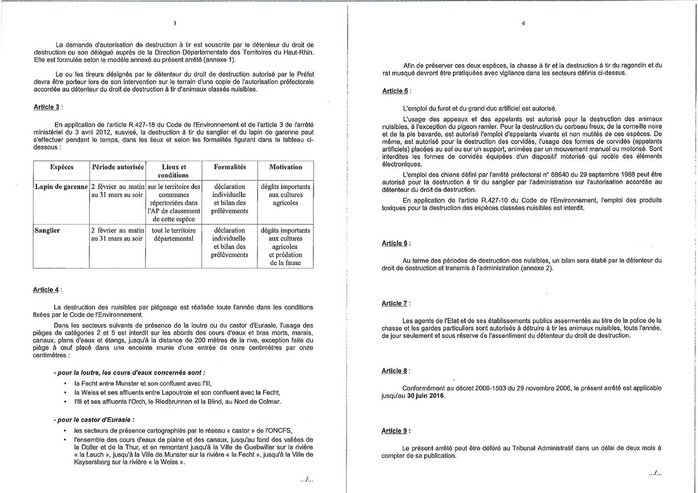 Arrêté préfectoral - modalités de destruction des animaux classés nuisibles