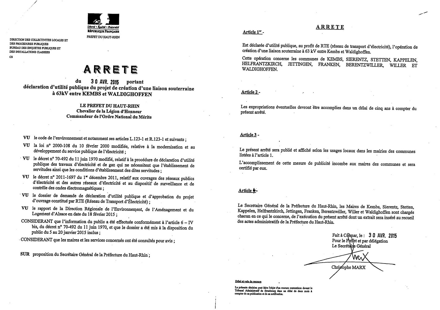 Arrêté du 30 avril 2015 portant déclaration d'utilité publique du projet de création d'une liaison souterraine entre KEMBS et WALDIGHOFFEN