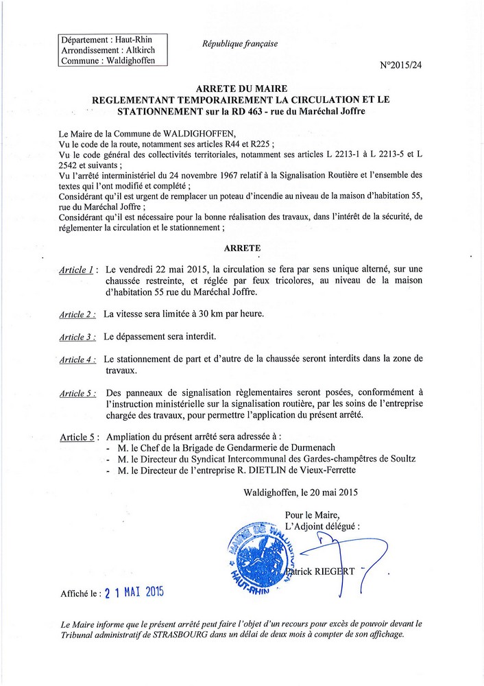 Vous êtes ici : Accueil Mairie Affichage public Annexes affichage public 2015 Arrêté règlementant la circulation et le stationnement