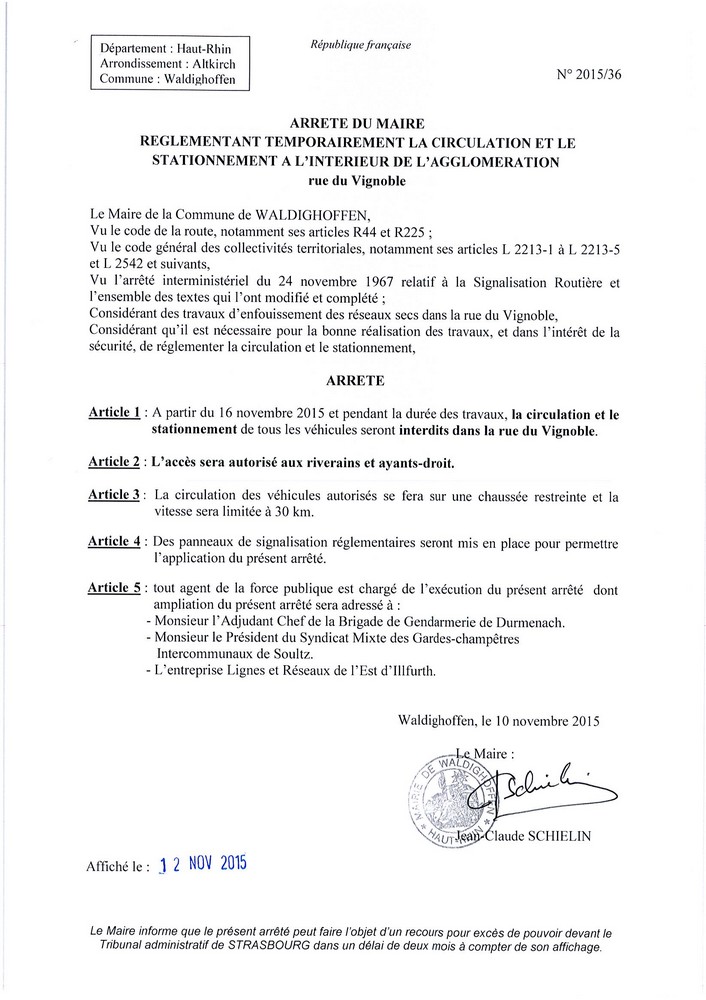 Arrêté du Maire règlementant temporairement la circulation et le stationnement dans la rue du Vignoble à partir du 16 novembre 2015.