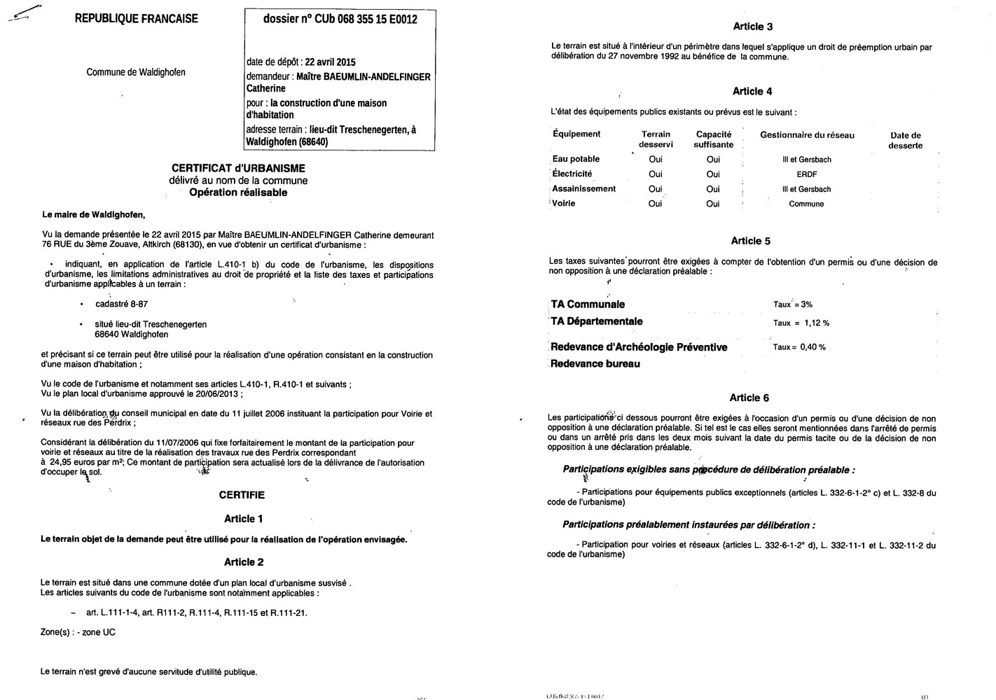 Certificat d'urbanisme délivré à Maître Catherine BAEUMLIN-ANDELFINGER, notaire