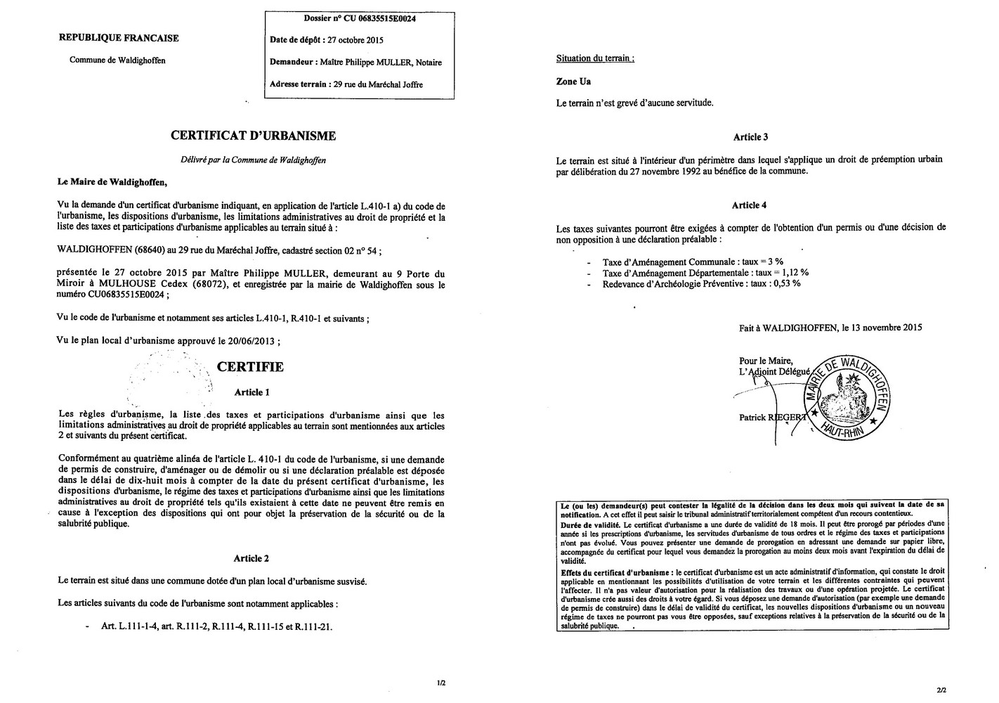 Certificat d'urbanisme délivré à Maître MULLER, notaire